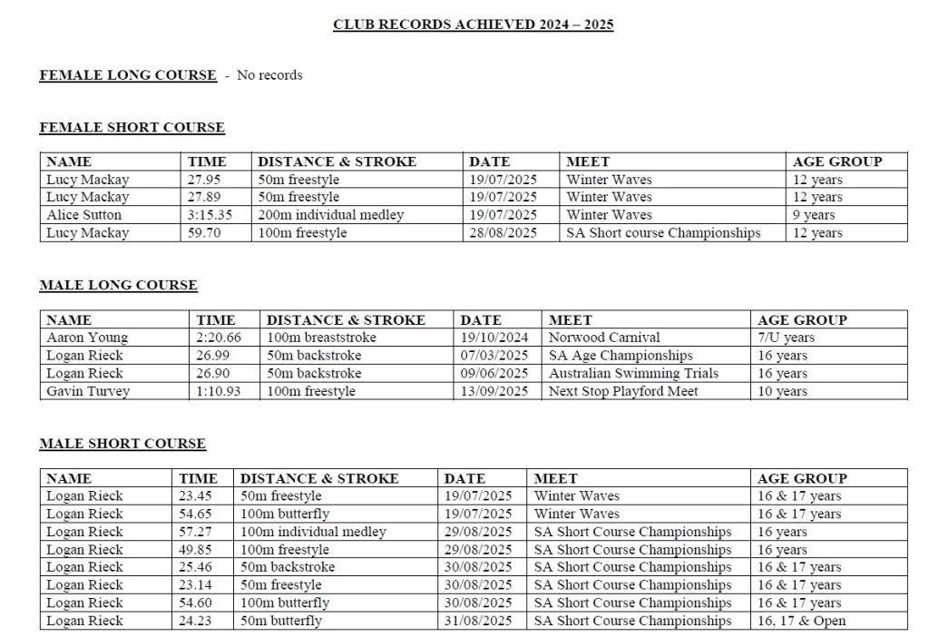 Club Records Achieved 2024-2025